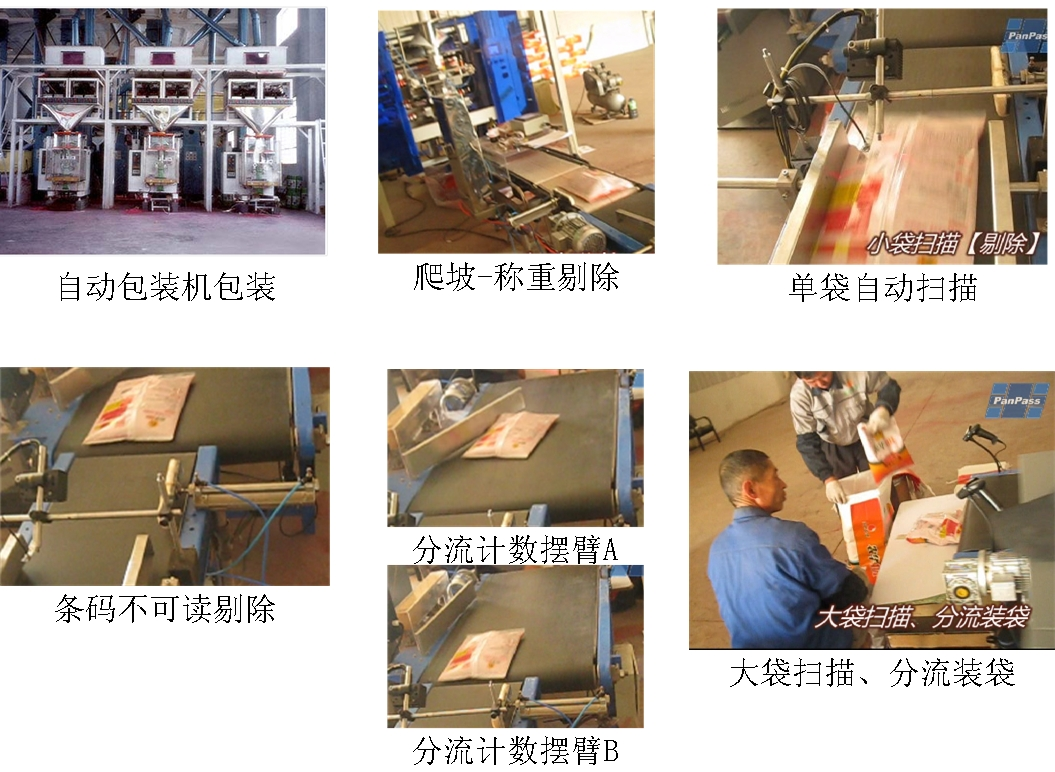 包裝線實現過程:固定式采集平臺自動掃描小袋——剔除裝置(條碼不可讀剔除)——計數擺臂分流(左右道)——人工掃大袋條碼(預先縫紉)